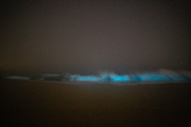 Explosion of neon blue in waves crash onto shore in Newport Beach